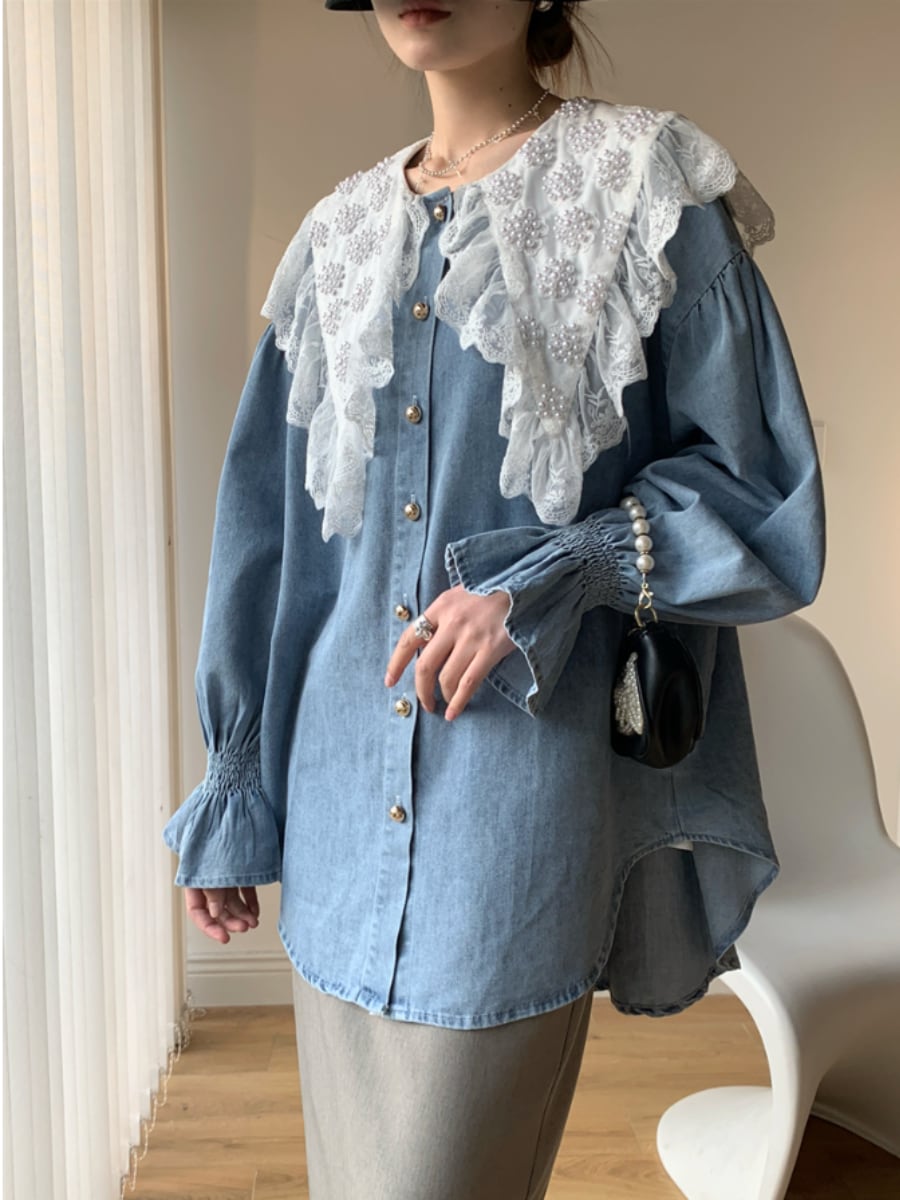 ヴィンテージライクな雰囲気漂うデニムブラウス。繊細なレースを大胆にあしらったデザインが、甘さとカジュアルさを絶妙にミックス。ゴールドボタンが上品なアクセントになり、細部までこだわりを感じる一枚。