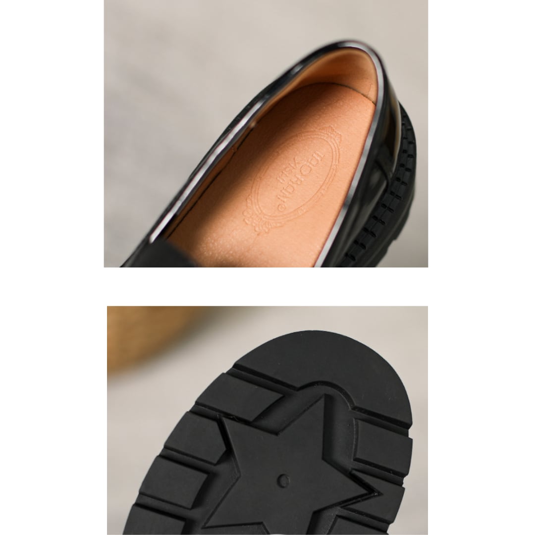 ボリューム感のあるソールと光沢感が目を惹く、タッセル付きローファー。
