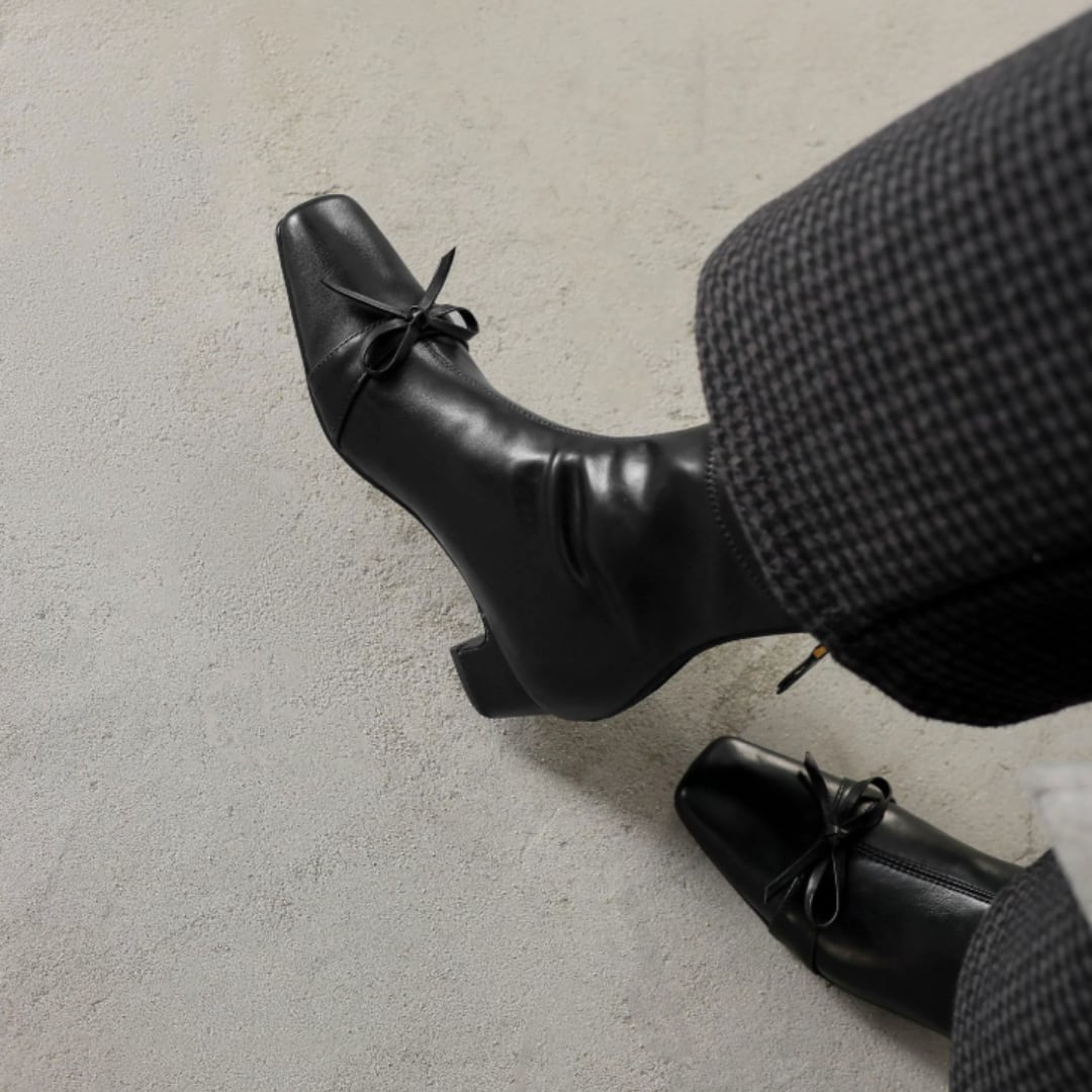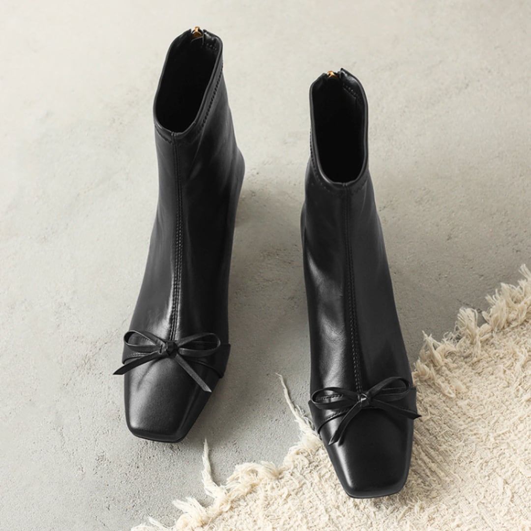 トレンドのスクエアトゥに、華奢なリボンがアクセントを添える上品ショートブーツ。