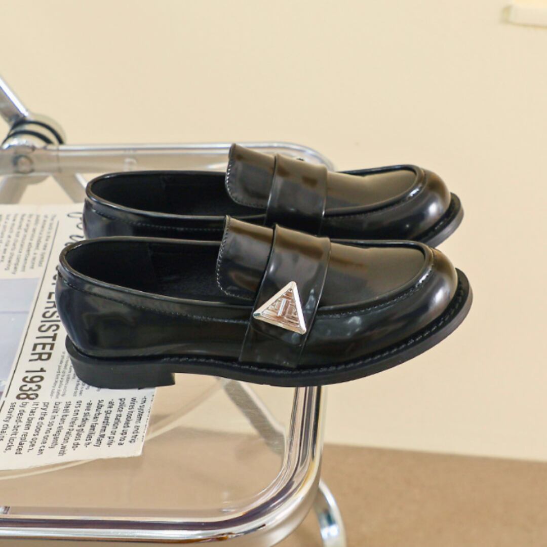 ツヤのあるPU加工と、トライアングルのメタルパーツがスタイリッシュな足元を演出します。