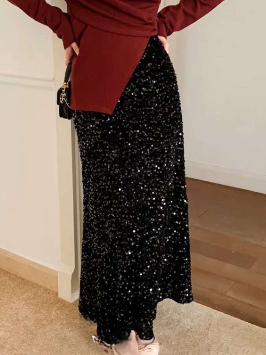 このスパンコールマキシスカートは、エレガントなデザインと洗練されたシルエットが特徴です。