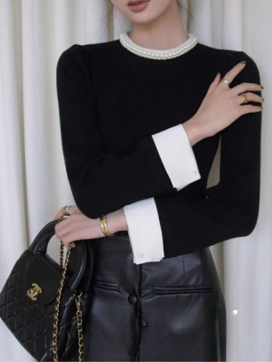 上品なパール装飾の襟元が魅力的なニットブラウスです。