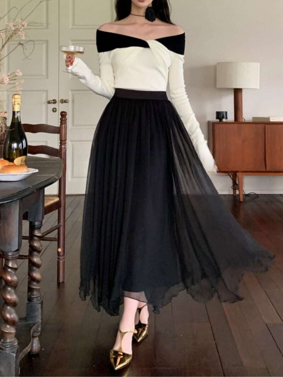 ブラックとアイボリーのツートーンカラーが絶妙なコントラストを生み出し、視線を集めます。首元はしなやかなラインを引き立てるオフショルダー仕様で、フェミニンさと上品さを兼ね備えています。