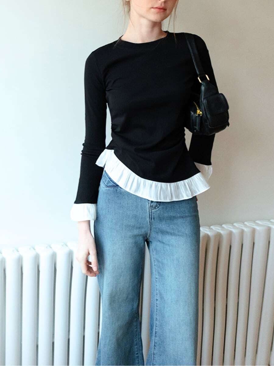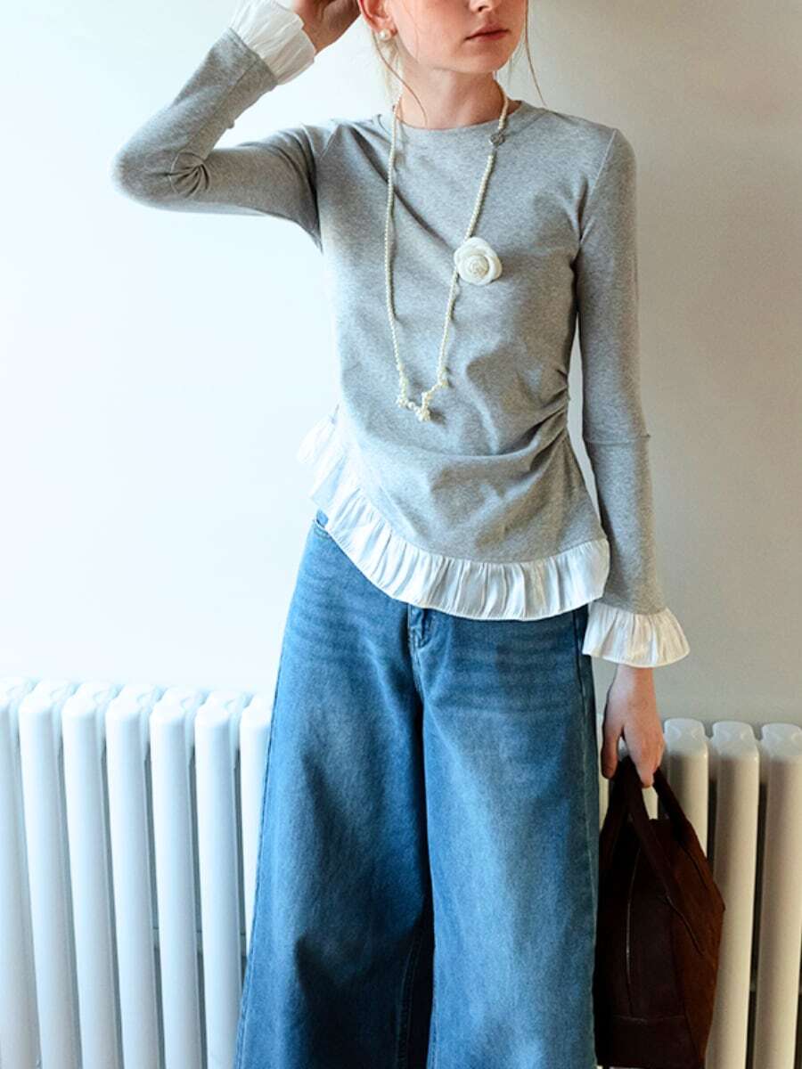 優雅なフリルディテールが際立つロングスリーブトップスです。