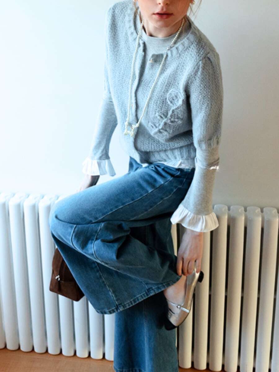 胸元には繊細なフラワーモチーフの編み込みデザインを施し、可憐さと個性をプラスしました。袖丈はショートスリーブ仕様で、季節を問わずコーディネートに取り入れやすいアイテムです。