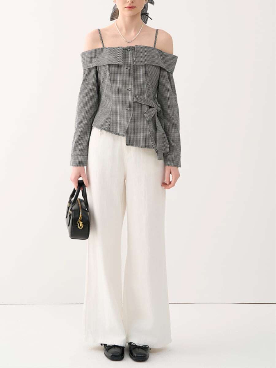 クラシカルなギンガムチェックと個性的なオフショルダーのデザインが融合したブラウス。