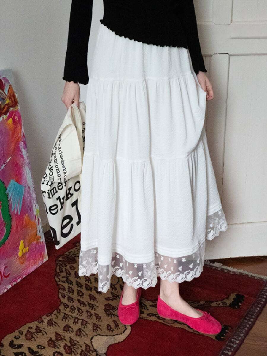 繊細なレースとティアードデザインが魅力のミディスカート。