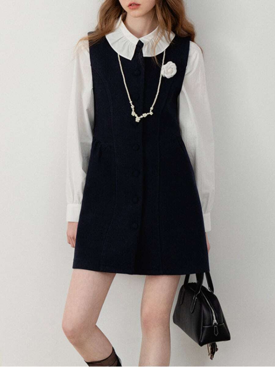 ラッフルカラーが顔まわりを華やかに彩りつつ、全体を上品にまとめています。