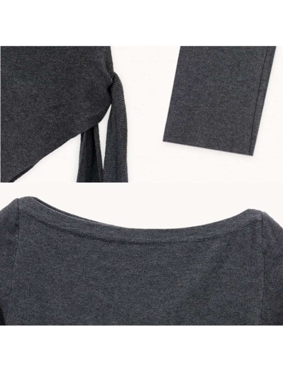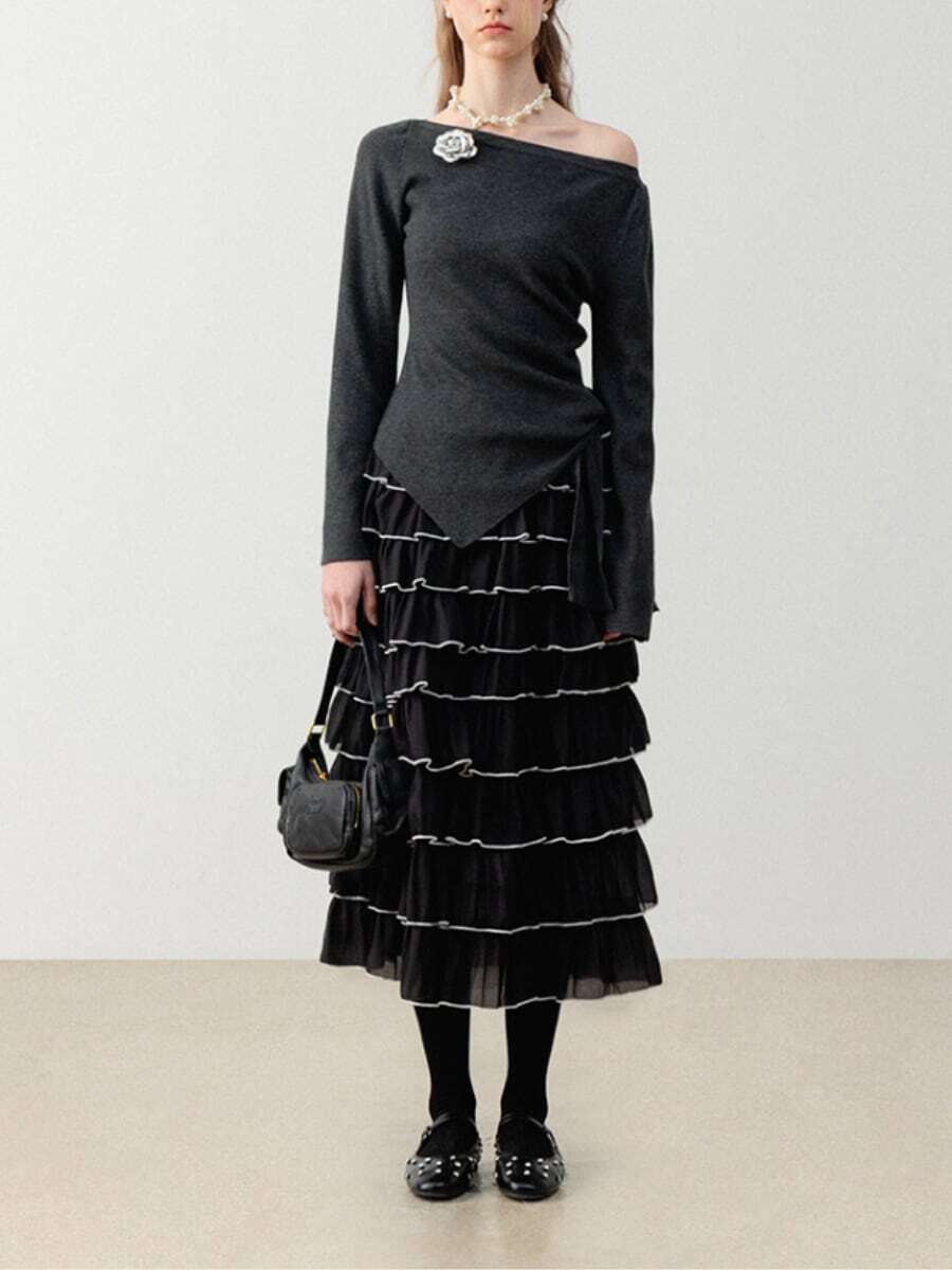 オフショルダーのシルエットが、女性らしい魅力を引き立て、上品で洗練された印象を与えます。