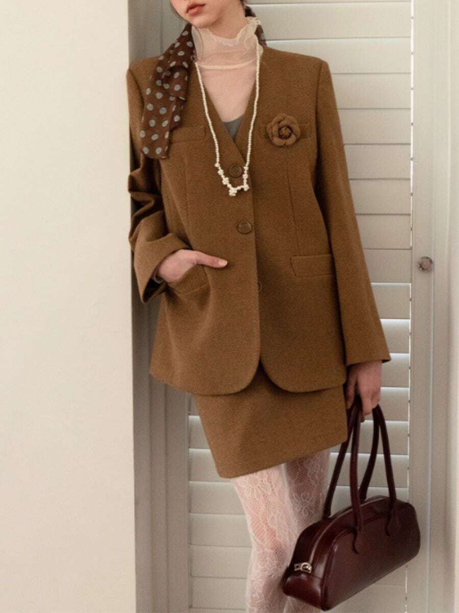 ジャケットはVネックデザインで、フェミニンさとモダンな印象を両立。付属のフラワーブローチがアクセントになり、さりげないおしゃれ感を演出します。また、ポケットがついており実用性も兼ね備えています。