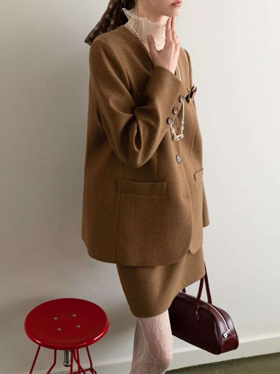 洗練されたデザインが魅力のウール混スカートスーツです。落ち着いた色合いと上品なシルエットが、ビジネスシーンやフォーマルな場でも活躍するアイテムです。