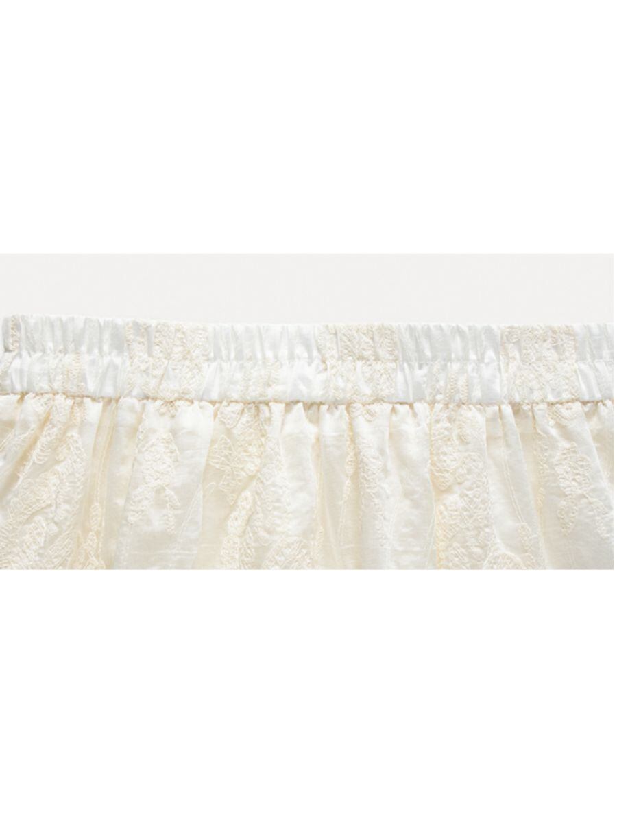 ウエスト部分はゴム仕様で、快適なフィット感と着脱のしやすさを両立。ホワイトカラーのレースがコーディネートに清楚でフェミニンなアクセントをプラスします。
