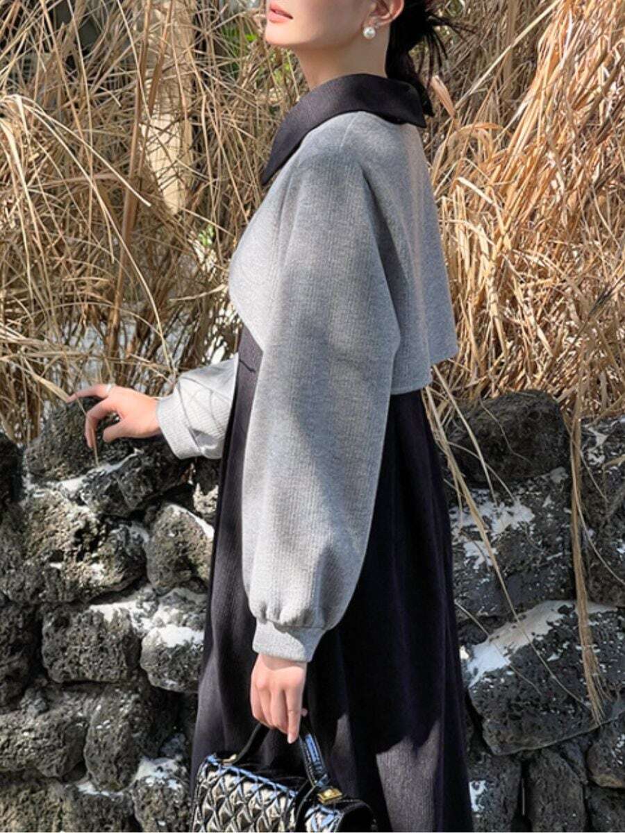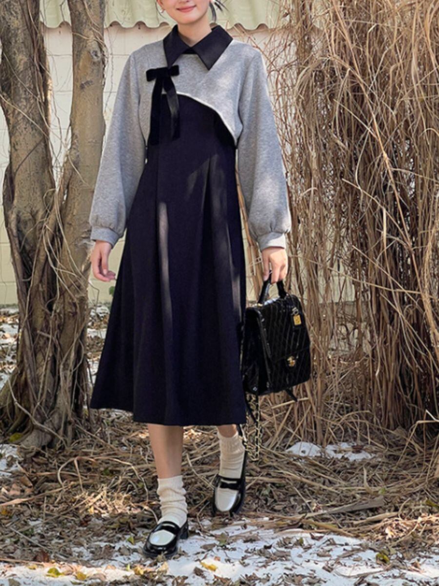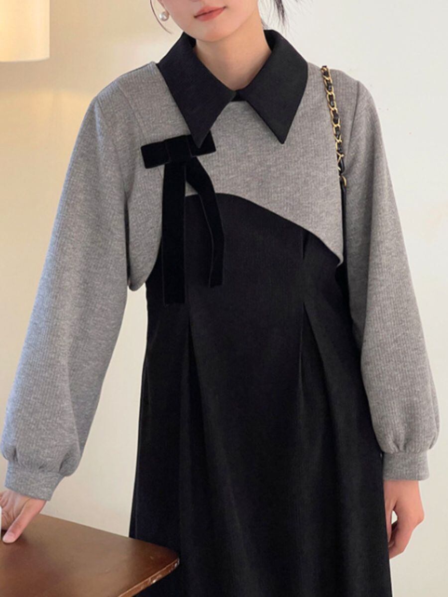 クラシックなデザインとカジュアルな要素が絶妙に融合した、ボウカラードレスです。上品なグレーのトップスとブラックのスカート部分が、バランスの取れたエレガントな印象を与えます。