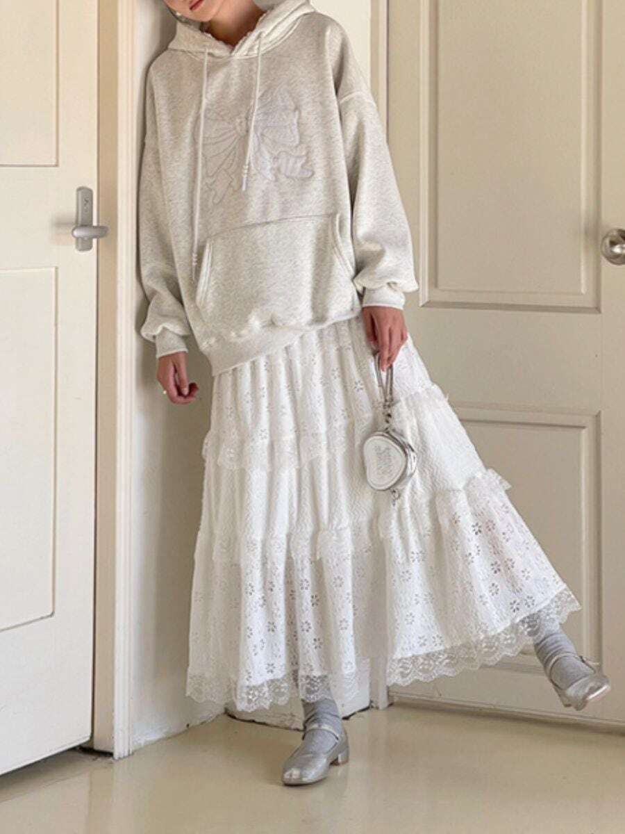 繊細なレースディテールが施されたティアードスカートは、上品でロマンティックな雰囲気を演出します。一枚で華やかな印象を与え、どんなシーズンでも活躍する万能アイテムです。