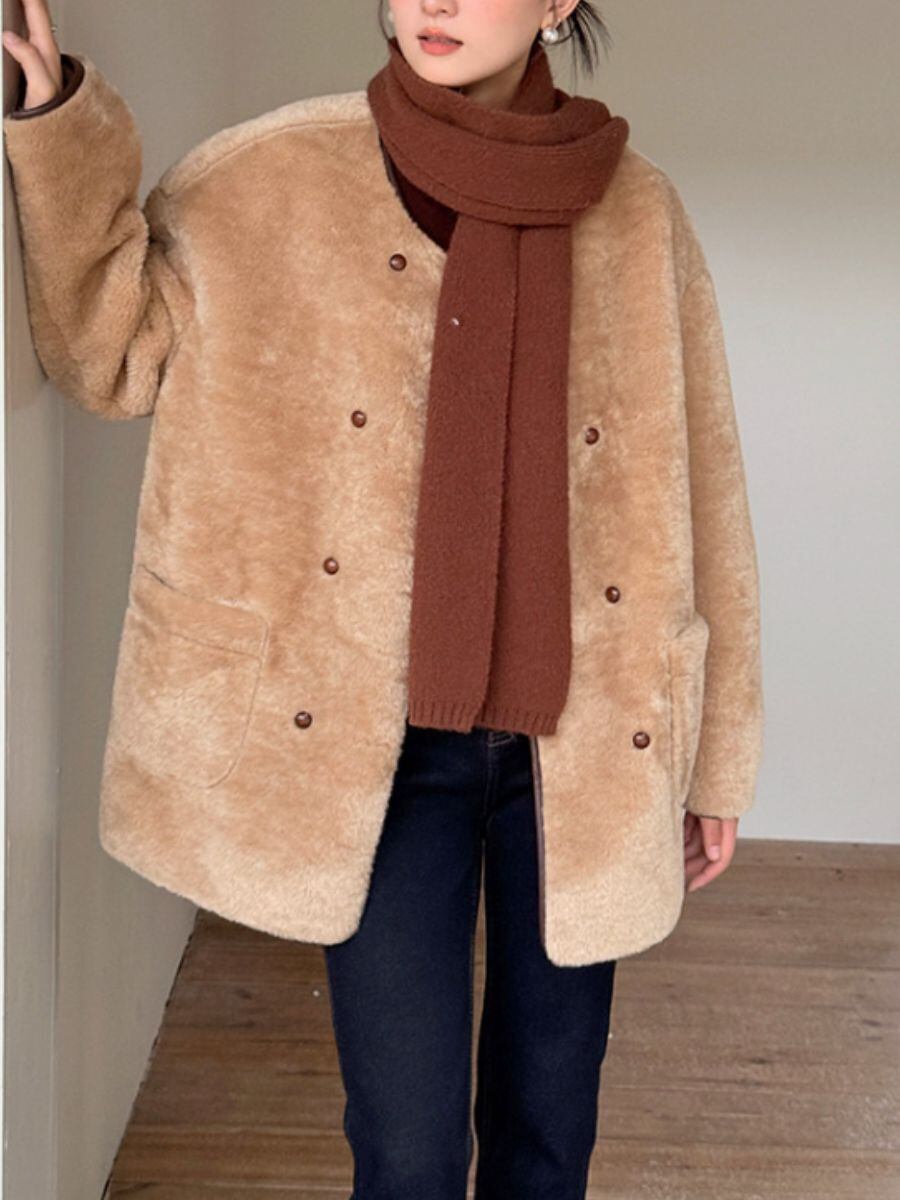 上質な柔らかいシェアリング素材を使用したダブルボタンコート。クラシックなデザインで、軽やかでありながらしっかりと暖かさを保ちます。