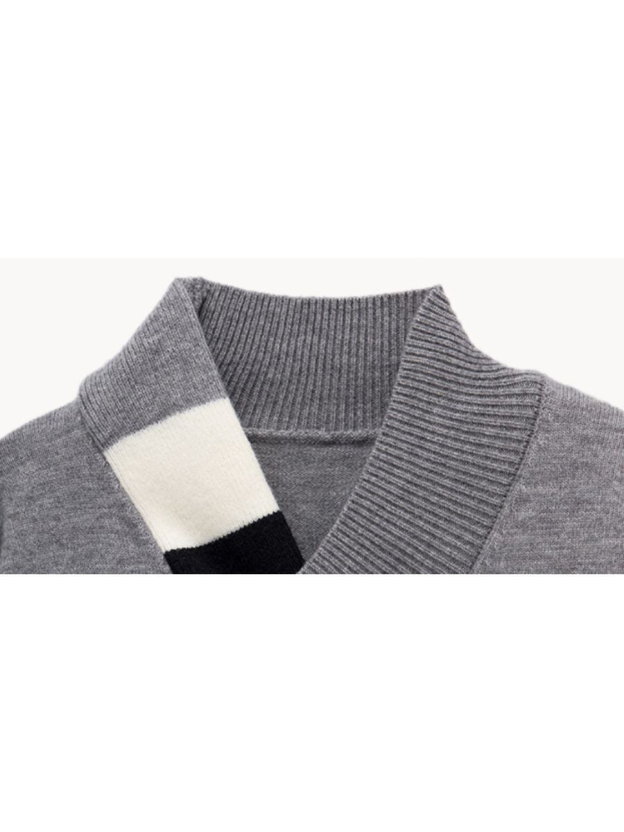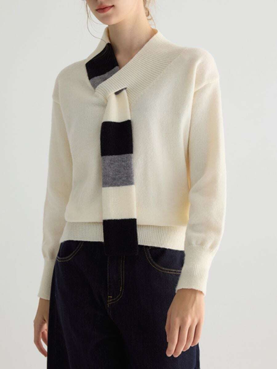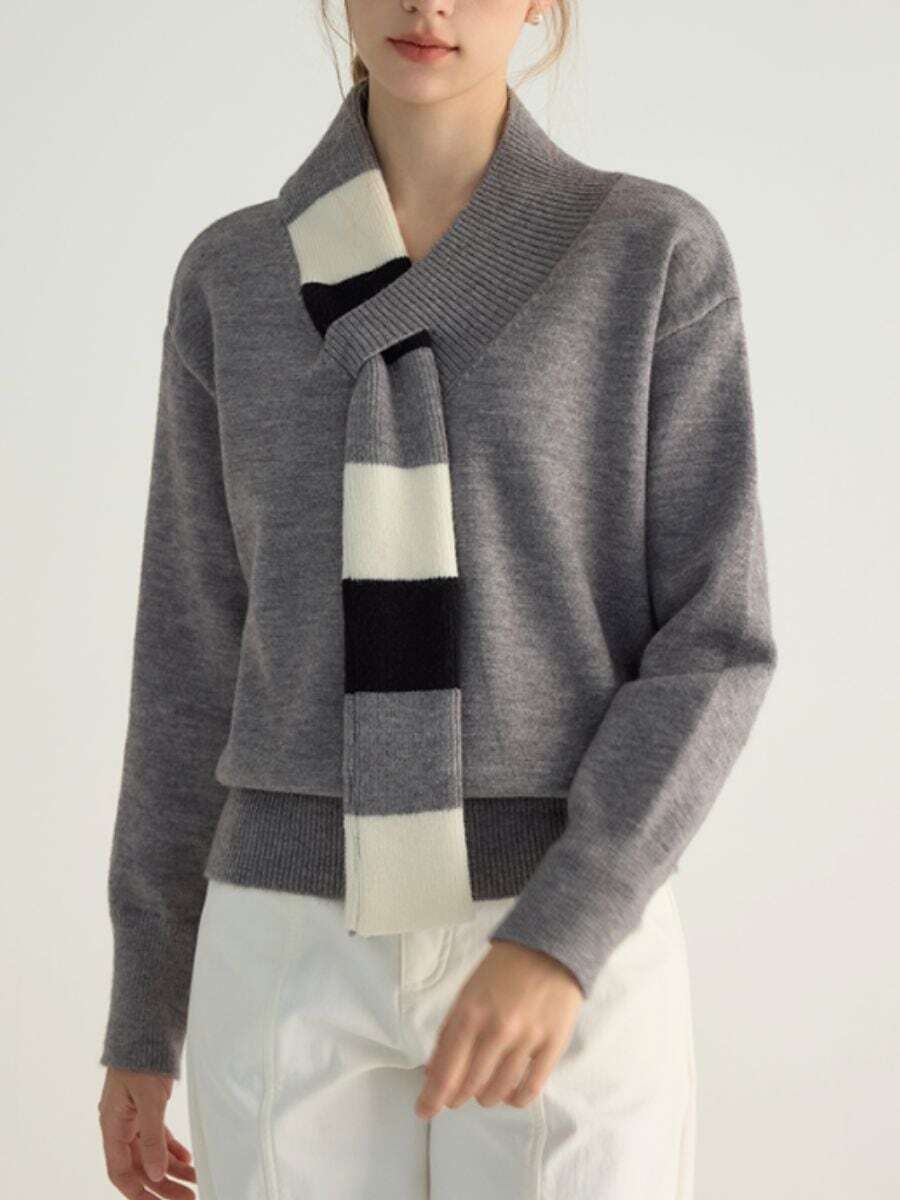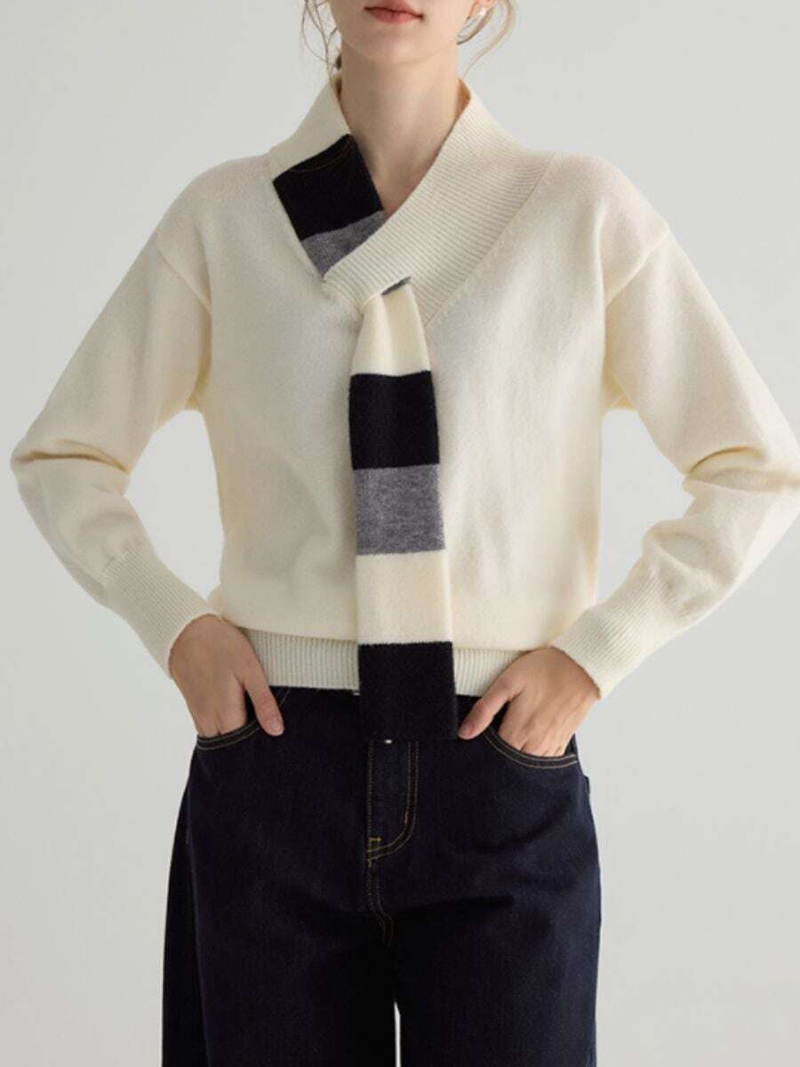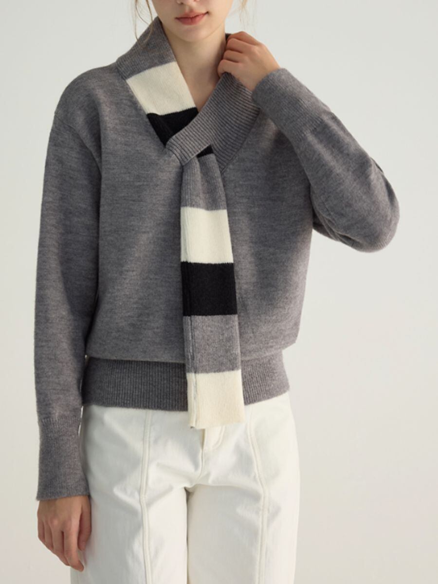 シンプルながらもスタイリッシュなデザインのスカーフ付きセーター。