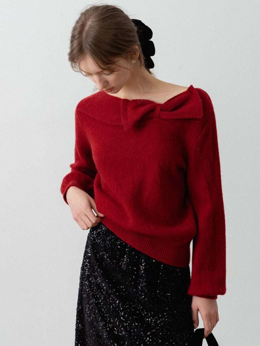 エレガントでフェミニンな印象を与えるボウディテールが魅力的なウールセーターです。