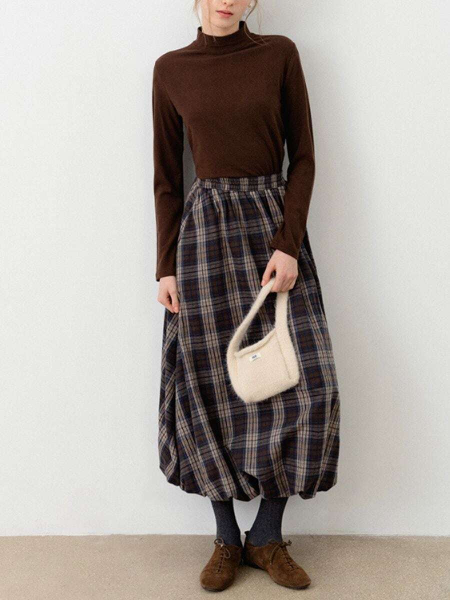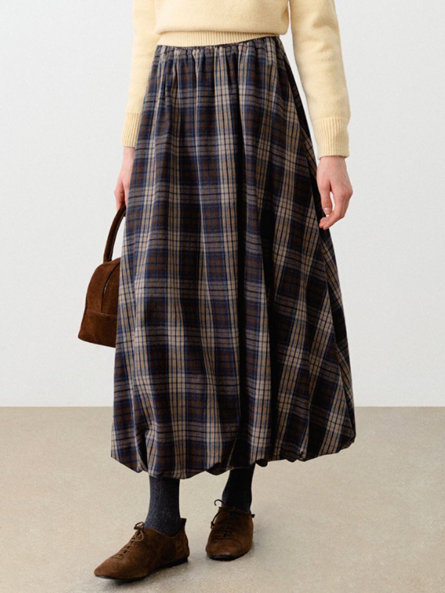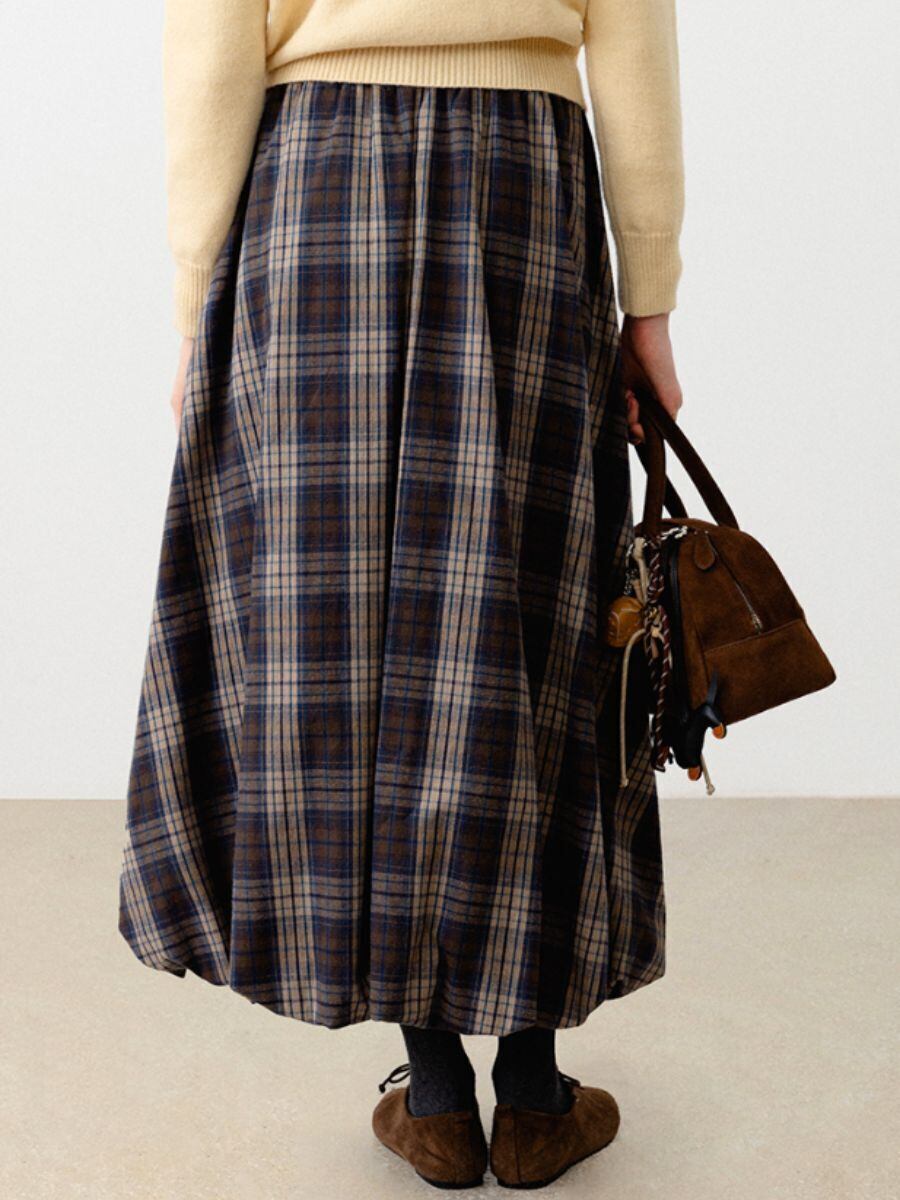 暖かみのあるチェック柄のフランネル生地で作られたマキシスカートです。