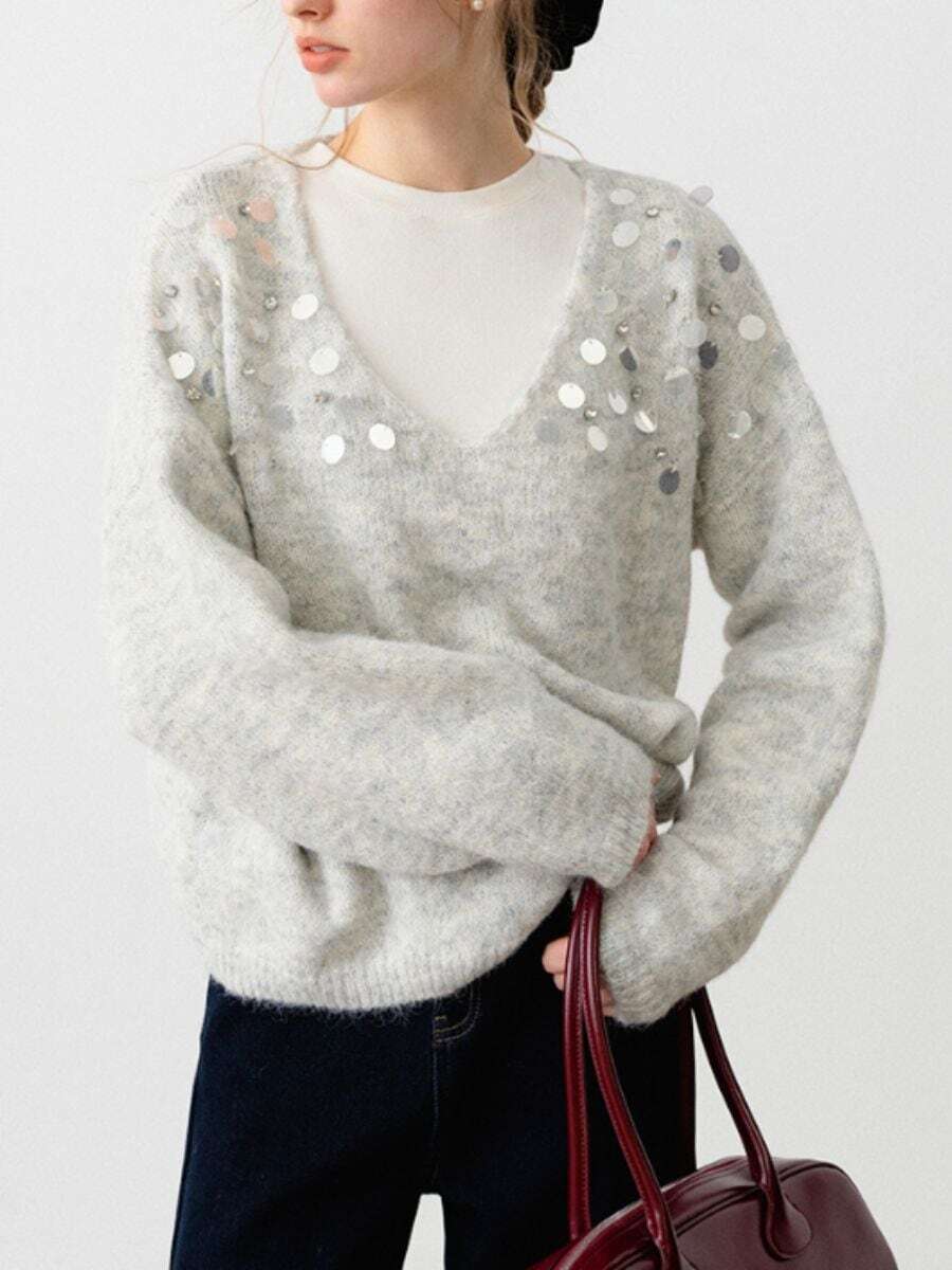 クラシカルなVネックとドロップショルダーが、リラックス感のある着心地と上品さを両立させています。肩から胸元にかけて装飾された大きめのシークインが華やかさをプラスし、カジュアルからドレッシーなコーディネートまで幅広く活躍します。