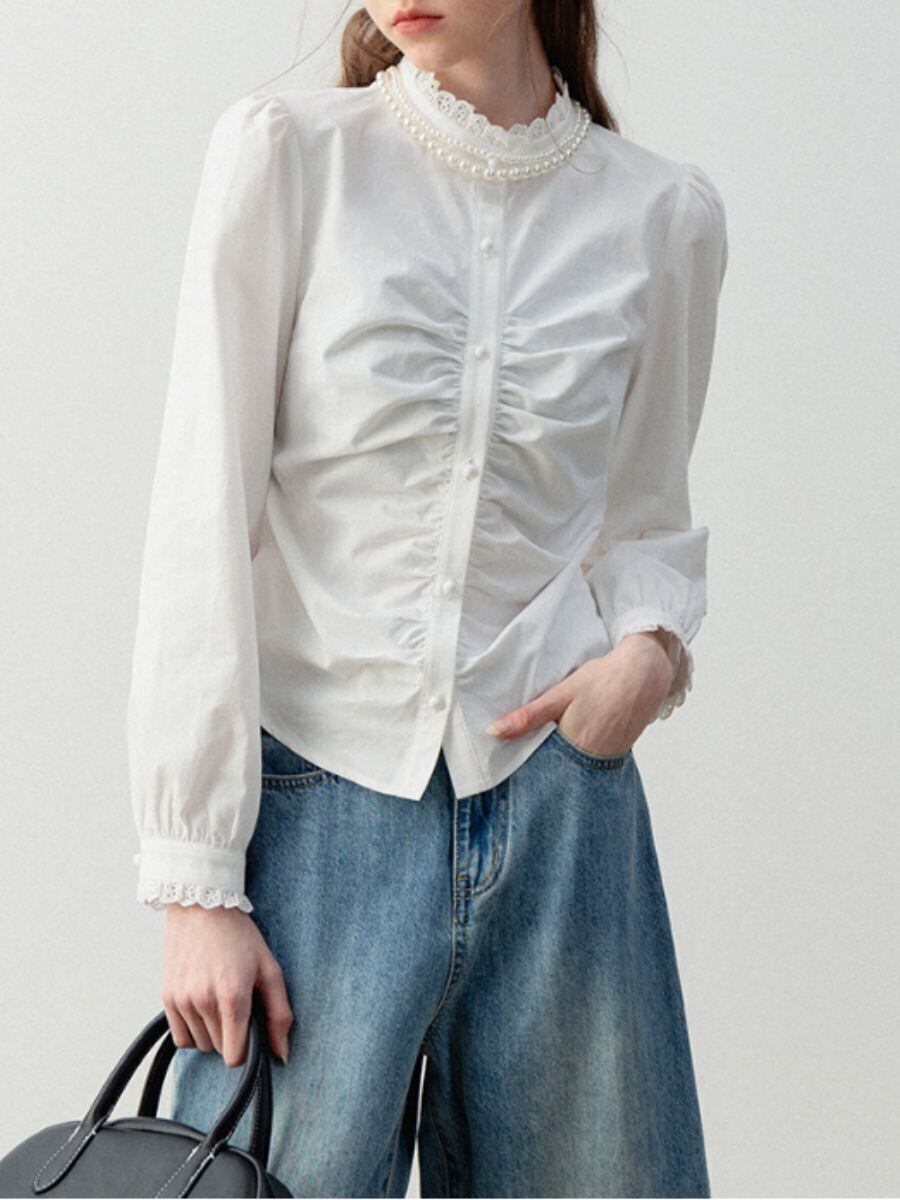 繊細なレースとシャーリングディテールが特徴のコットンブラウスです。上品な印象と女性らしさを兼ね備えた一着で、特別な日や日常使いにもぴったりです。