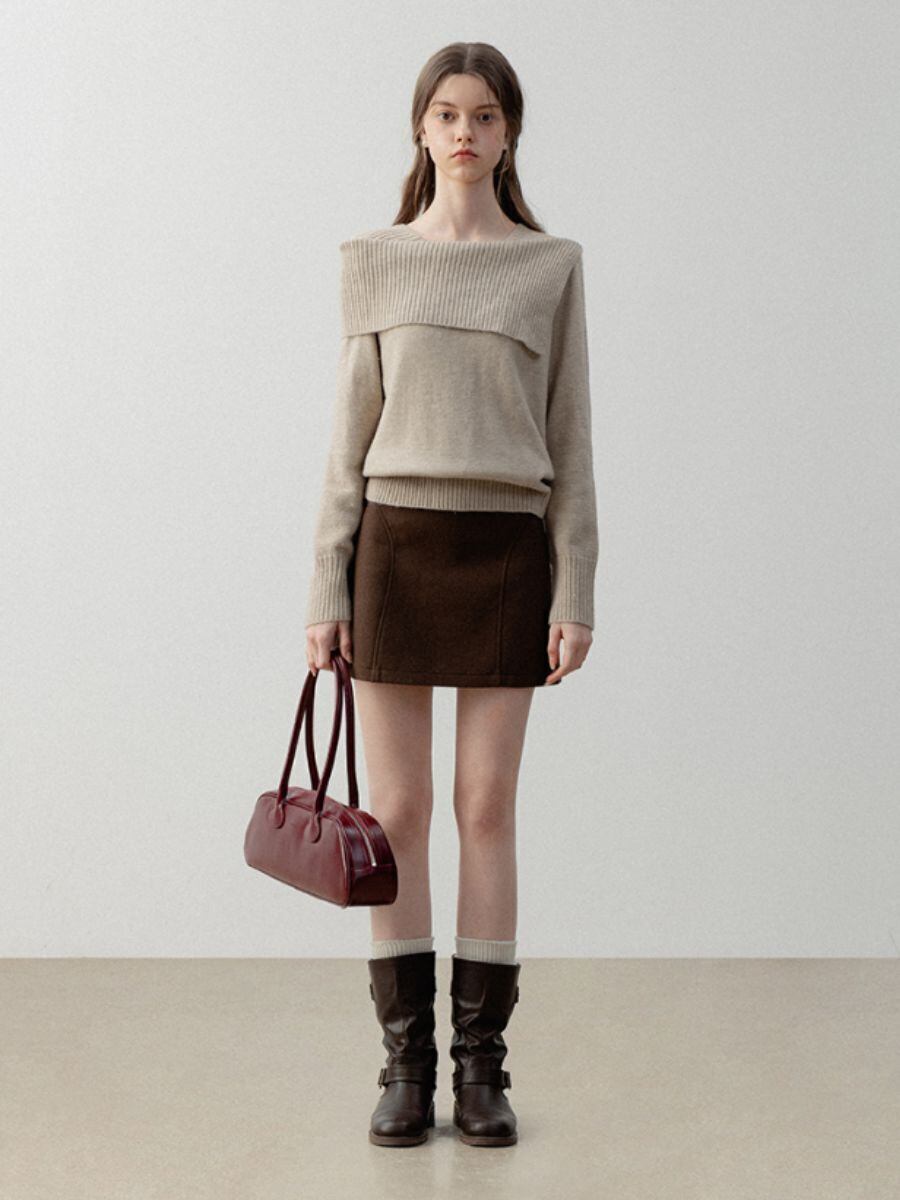 エレガントで洗練された印象を与えるオフショルダーデザインのニットトップスです。