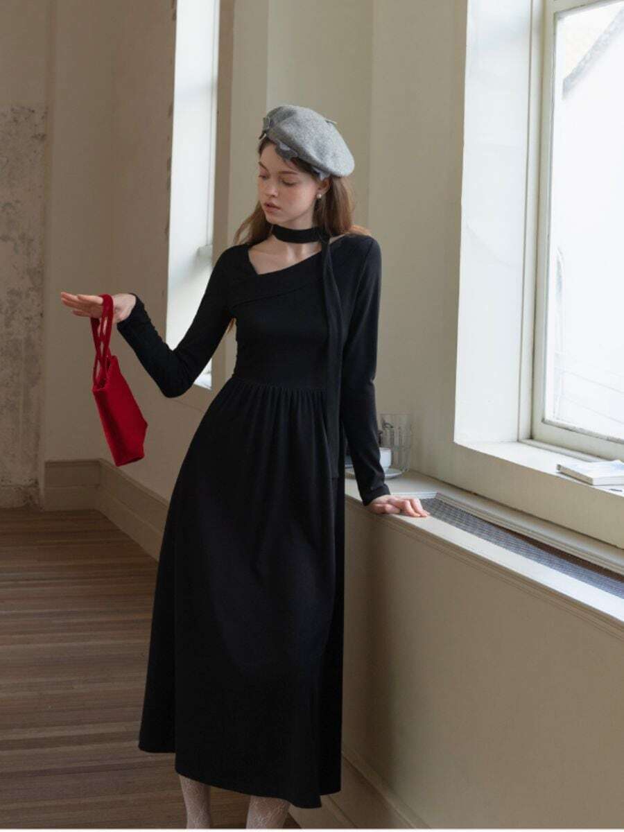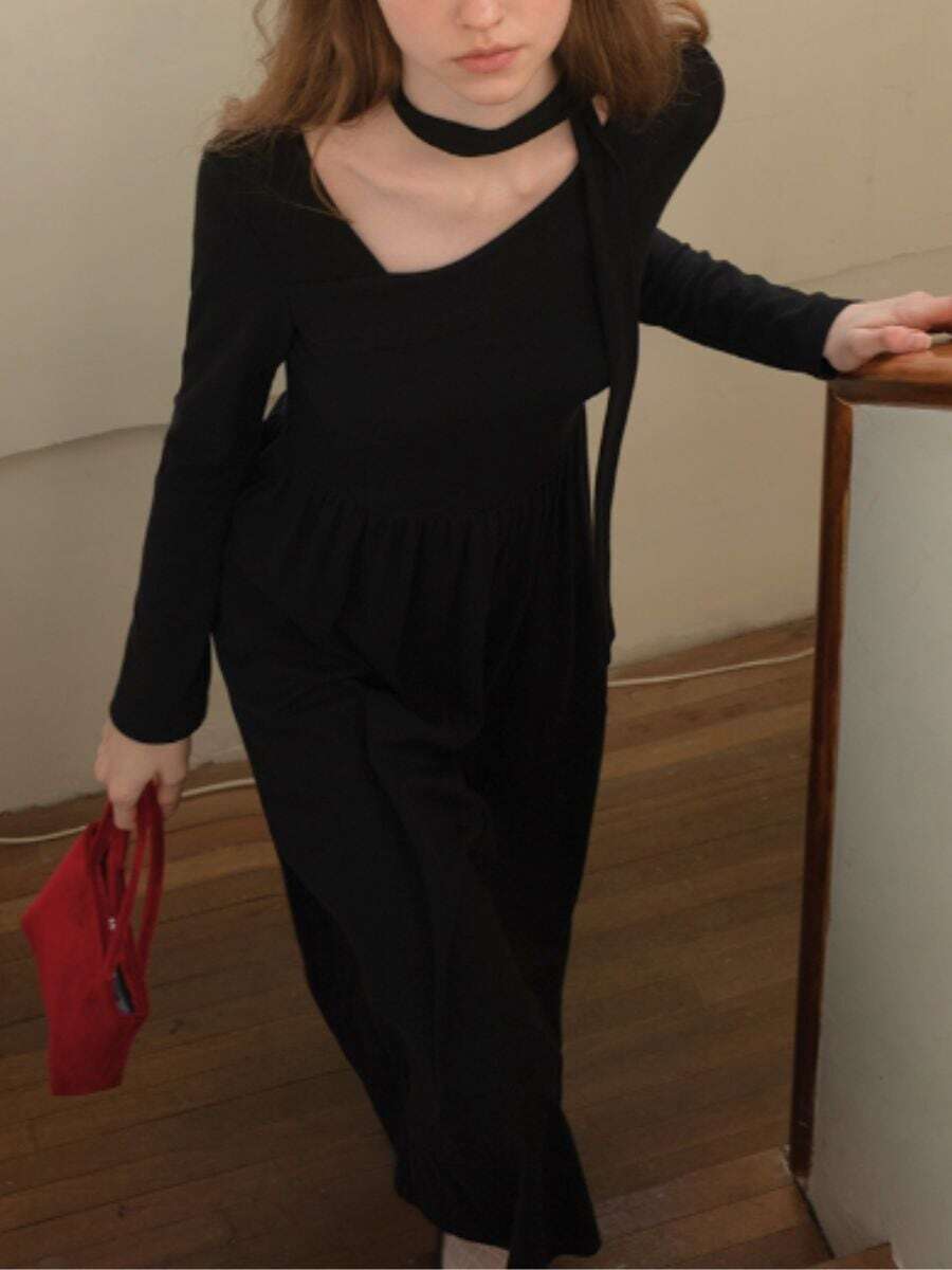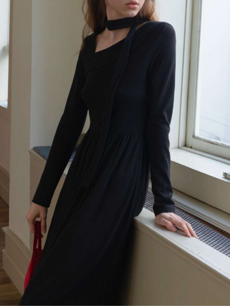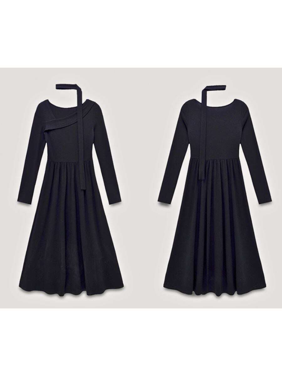 流れるようなシルエットが美しいブラックのミディ丈ドレスです。