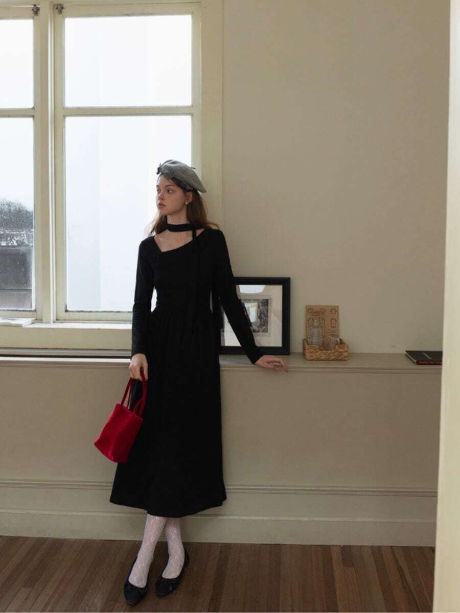 アシンメトリーデザインのネックラインが、シンプルながらも洗練されたアクセントをプラスしています。