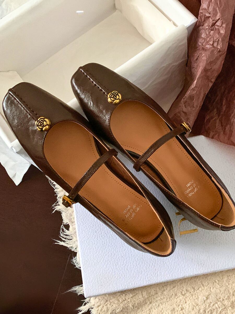 上品で可愛らしいデザインが魅力のフローラルチャーム付きメリージェーンシューズ。