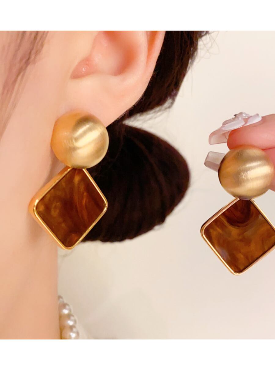 立体的なゴールドボールと、べっ甲風デザインのスクエアモチーフが組み合わさった個性的なピアスです。