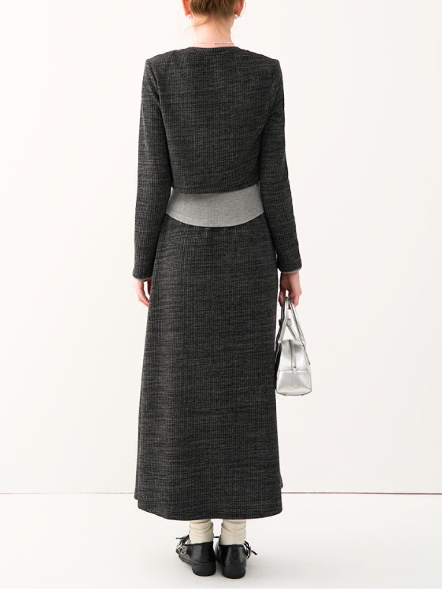 キャミソール・ショート丈ジャケット・ロングスカートの組み合わせで、シンプルながらも洗練された印象に。