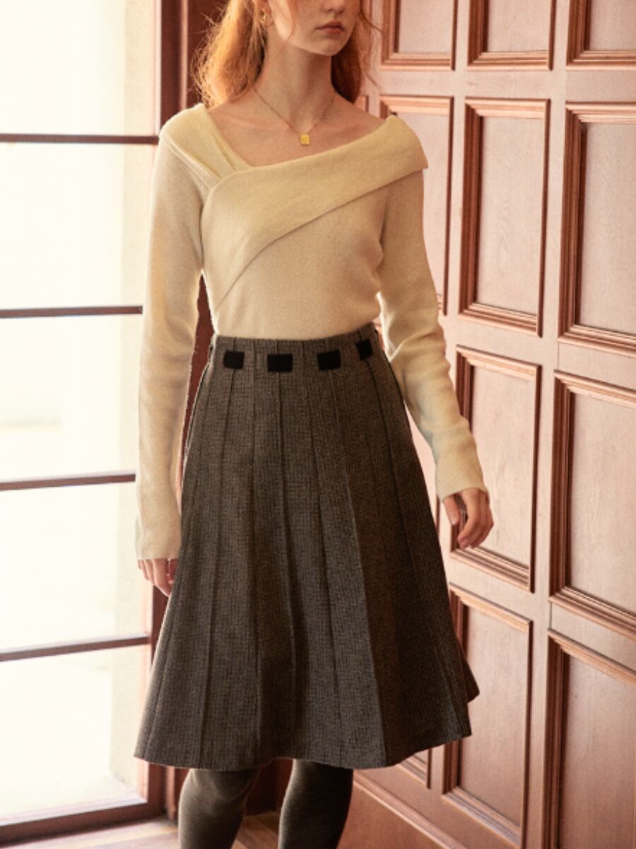上品で洗練された印象を与える、アシンメトリーなネックラインが特徴のウール混紡ニットトップス。1肌触りが柔らかく暖かさも抜群です。