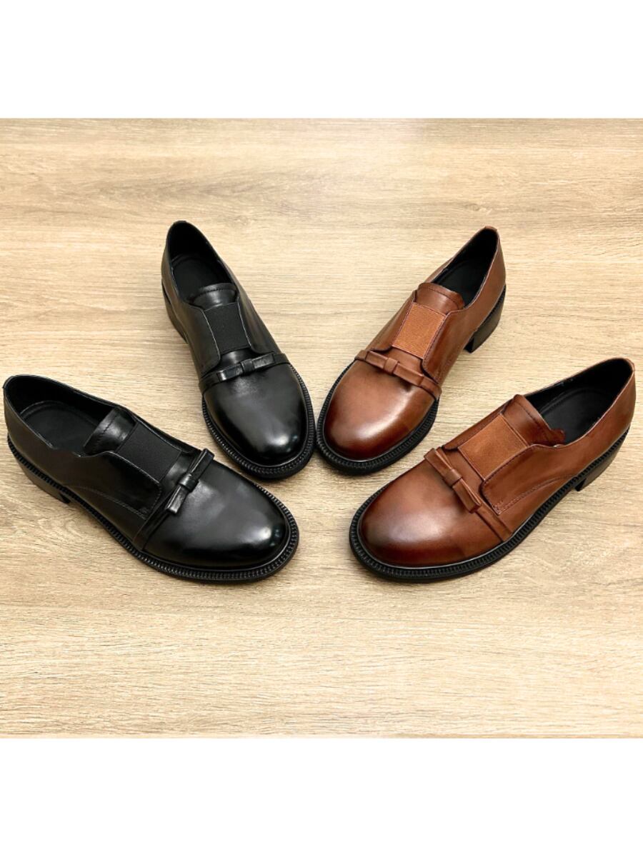 シンプルながらも、さりげないリボンデザインがアクセントになったローファー。履き口はゴム仕様で、足にしっかりフィットしながらも着脱しやすいデザインです。