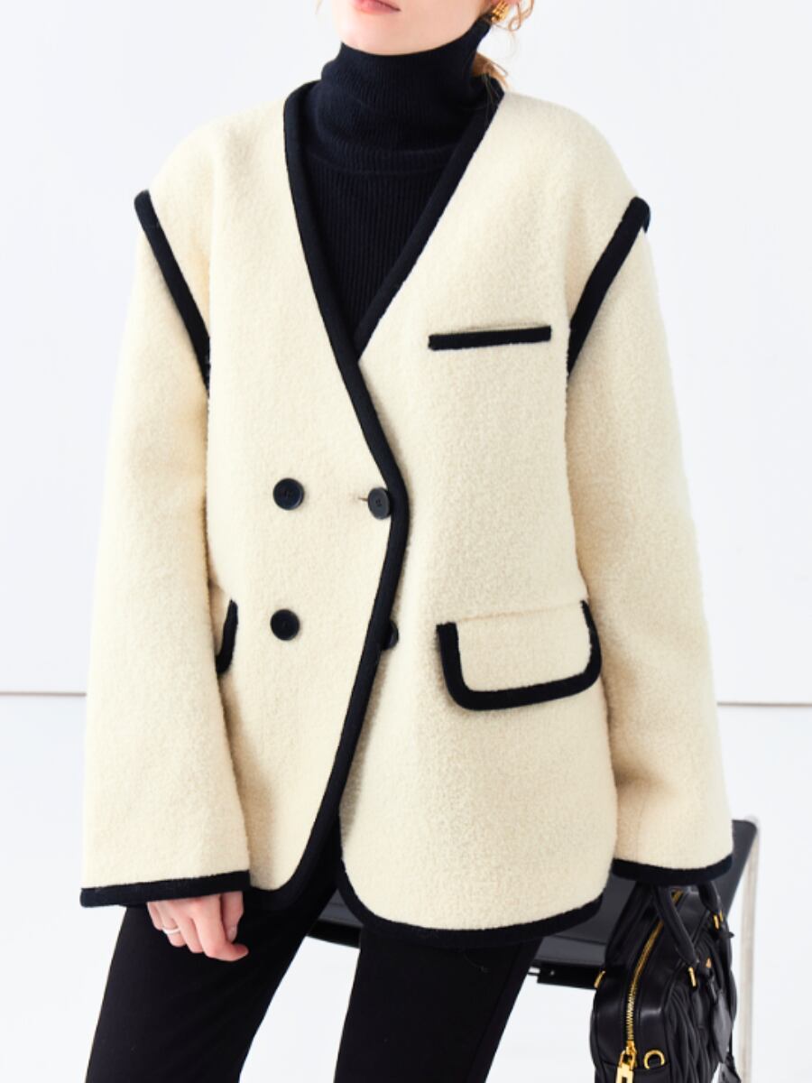 コントラストの効いたトリミングがモダンで洗練された印象をプラス。ボクシーなシルエットで、ゆったりとした着心地ながらもすっきりとしたラインを演出します。