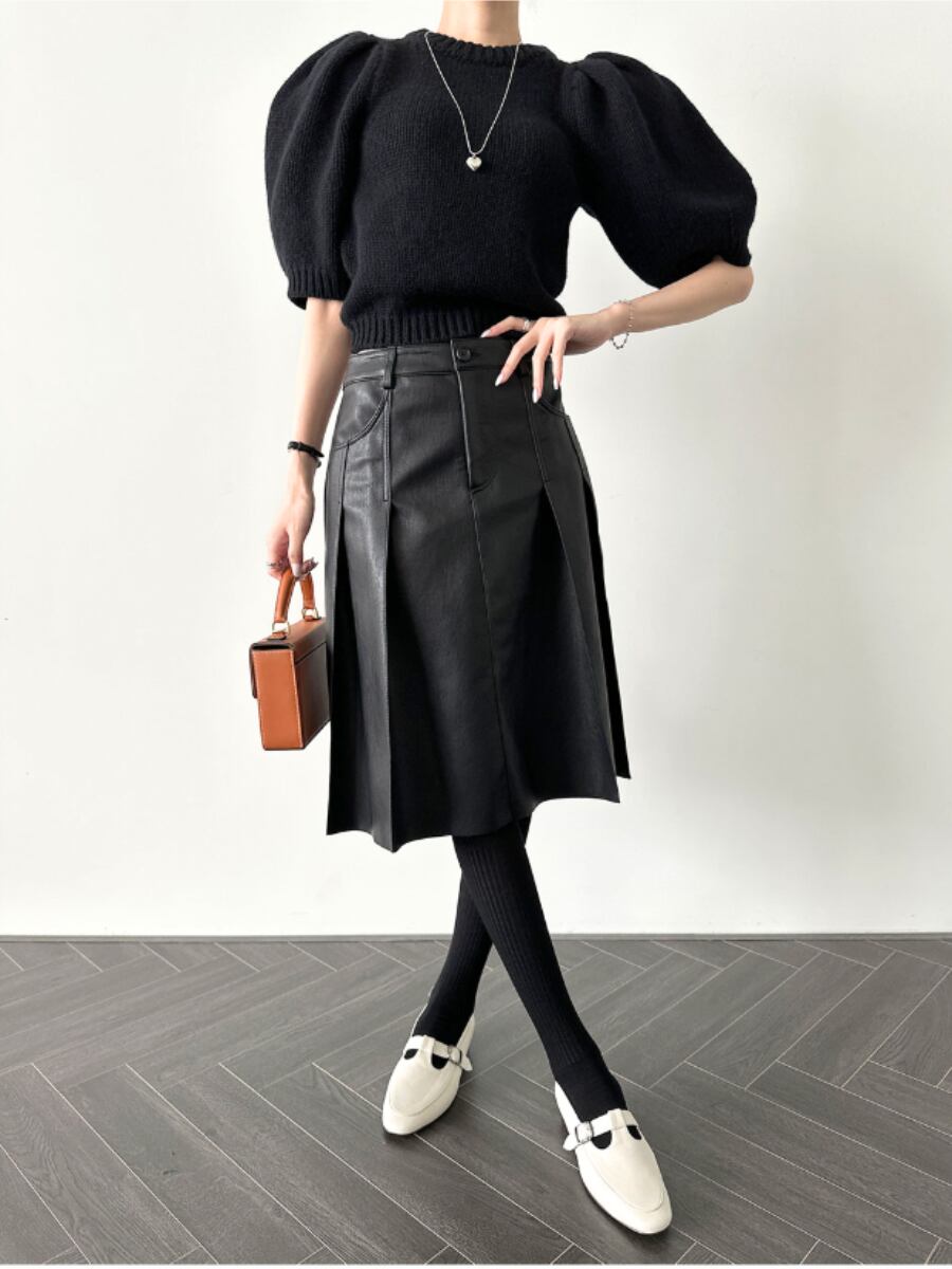 洗練された大人の雰囲気を演出するフェイクレザースカート。