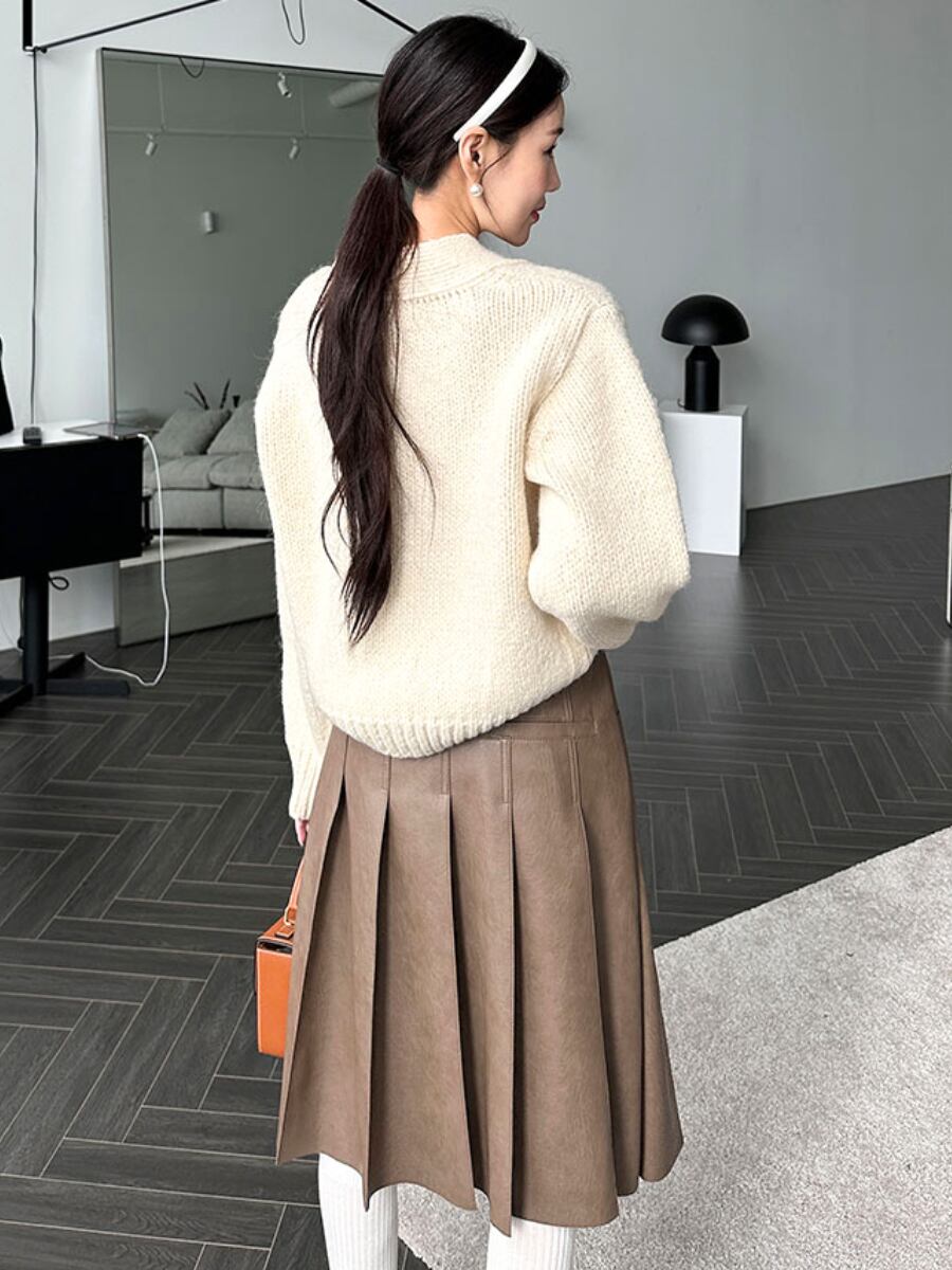 しなやかな質感のフェイクレザーを使用し、上品な光沢感と立体的なプリーツデザインが魅力。フロントにはカジュアルなポケットを配置し、程よく抜け感をプラスしました。