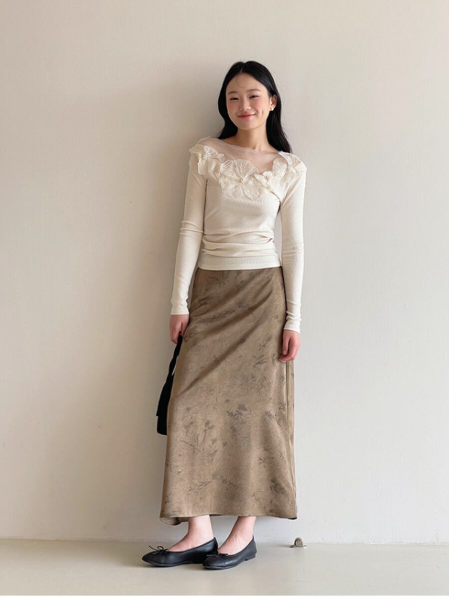 秋冬はジャケットやカーディガンのインナーとして、春先は一枚でフェミニンなスタイリングが楽しめます。デニムと合わせてカジュアルに、フレアスカートと合わせてエレガントに着こなせる万能アイテムです。